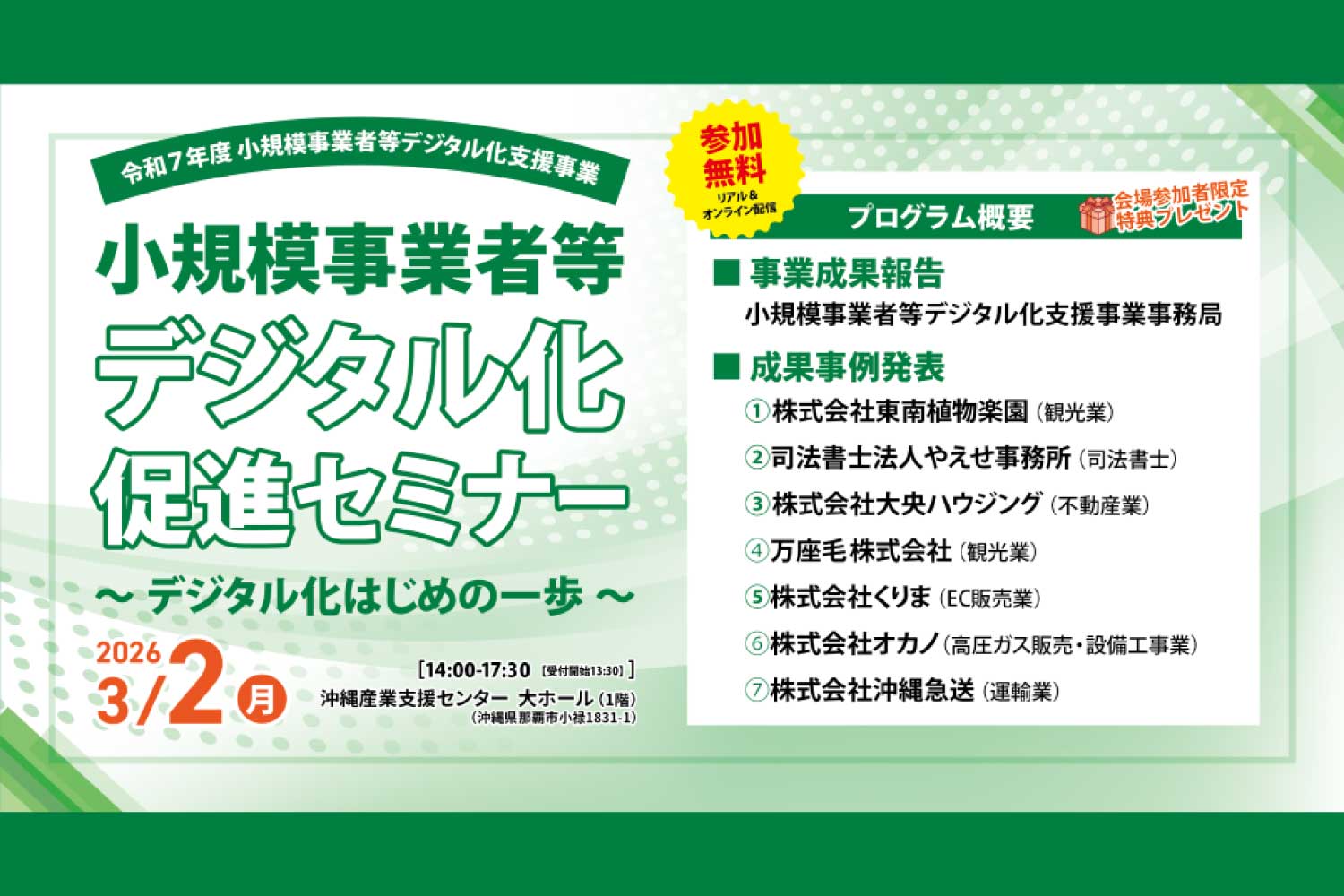 - 会場:沖縄産業支援センター 大ホール(1階)